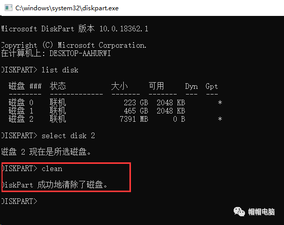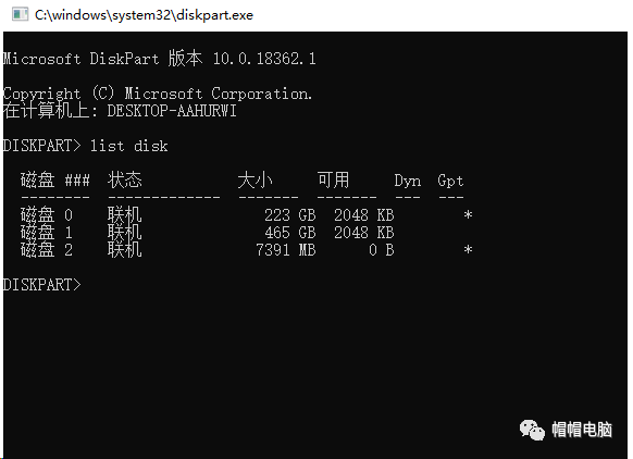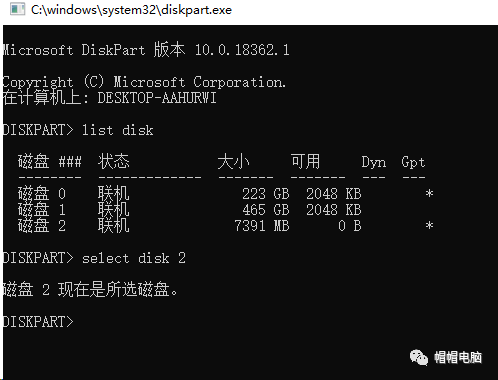 这里显示的是磁盘2,然后输入:select disk 2回车选择磁盘2;