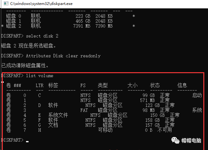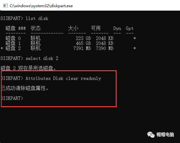 继续输入命令list disk,然后输入select disk 2(选择你的磁盘名字,注意别选错了)在输入Attributes Disk Clear ReadOnly回车。如下图一样。