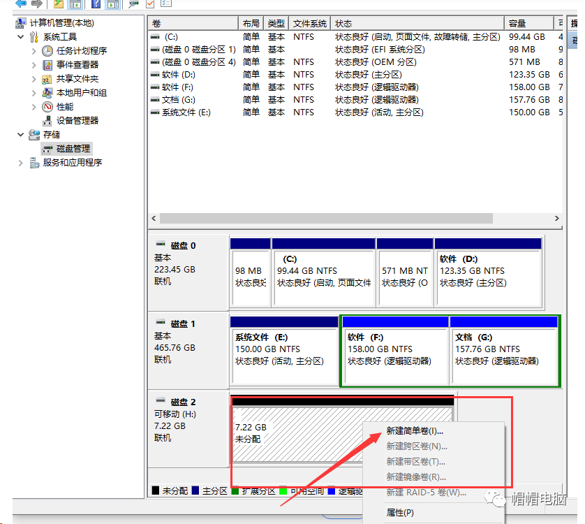 打开桌面电脑右键,选择管理。打开计算机管理界面,找到你要格式化的磁盘,右键选择新建简单卷。如下图。
